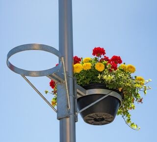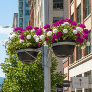 Classic Displays’ Floral Hoop is a durable steel floral basket holder designed to mount securely on street and hydro poles. Perfect for municipal streetscape décor and downtown beautification projects, this elegant hoop allows cities and BIAs to display hanging flower baskets safely and stylishly, creating vibrant, inviting public spaces. Easy to install and engineered for long-lasting performance, the Floral Hoop helps transform ordinary poles into striking elements of streetscape floral displays, bringing color and charm to sidewalks, plazas, and urban corridors across Canada. *Floral hoops are designed for a standard 16" basket with a coconut husk bottom, but can be modified based on your needs.