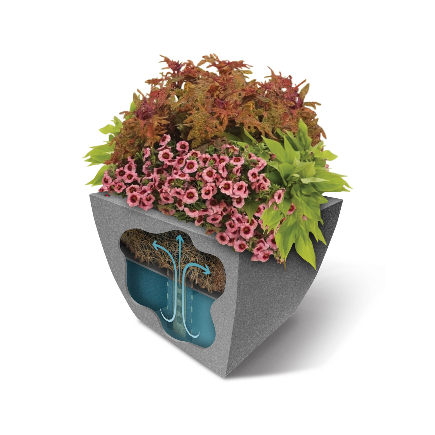 La série Metropolitan de jardinières à arrosage automatique est conçue avec des parois effilées qui éliminent l'élasticité causée par l'ajustement des niveaux d'eau.