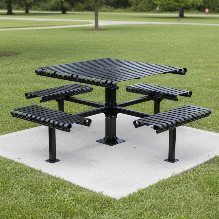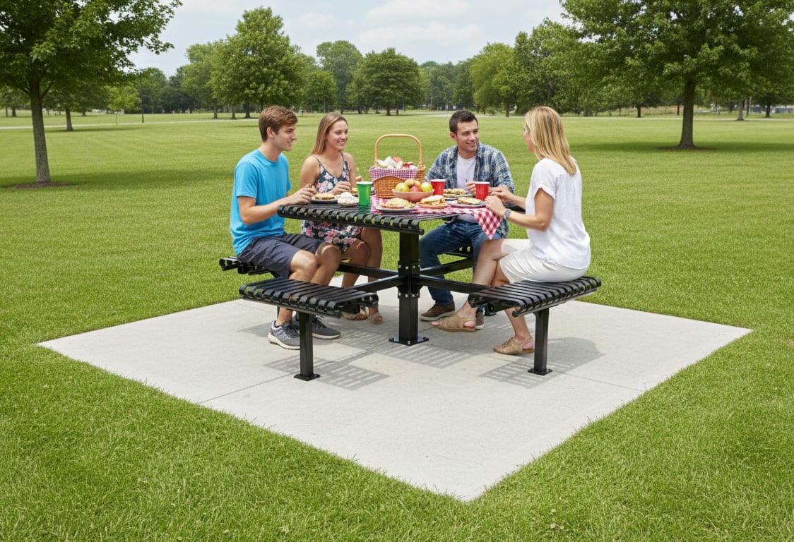 The Urban Flare Picnic Table offers a durable and stylish seating option for parks, streetscapes, and public spaces. Perfect for outdoor dining and relaxation.